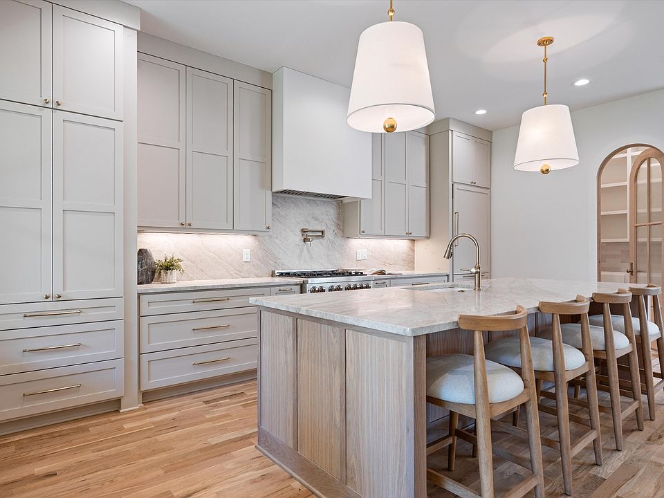 The kitchen offers a spacious layout with an oversized island, Taj Mahal countertops, cabinet panel appliances, and plenty of cabinet storage. A walk-in pantry provides additional space and functionality, while the dining area is perfectly positioned for entertaining.