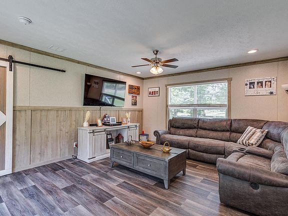 Experience peaceful country living in this beautifully maintained 2021 single wide home set on approximately 5 acres. With a spacious open floor plan, this home offers comfort, functionality, and modern touches throughout. Step into a large living area filled with natural light, recessed lighting, and a sliding glass door that opens to the backyard—perfect for relaxing or entertaining. The kitchen features a stainless steel farmhouse sink, ample cabinet space, and a pantry. Just off the kitchen is a convenient half bath and a laundry room with built-in cabinetry. To the right of the living room, a sliding barn-style door opens into a versatile flex space—ideal for an office, playroom, or guest area—leading to two generously sized bedrooms with a shared full bathroom. At the end of the hall, retreat to your private primary suite, complete with two walk-in closets and an en suite bath featuring a double vanity and stand-up shower. Enjoy modern fixtures throughout, large windows that let in an abundance of natural light, and a concrete walkway that leads to a welcoming front porch. The property also includes a lean-to for covered storage and plenty of room to roam or expand. If you're looking for quiet, modern country living with room to grow, this is the place to call home.