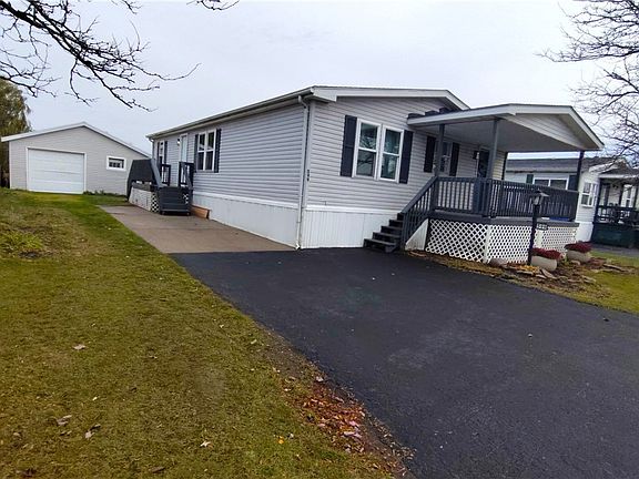 Welcome to 599 Birchwood Drive - This 1990 Patriot double-wide manufactured home is located at 599 Birchwood Drive in The Woodlands in Lockport NY. The outside of this home has many desirable qualities… offering plenty of room for parking & storage with the driveway space (blacktop recently sealed) as well as a 2-car garage; a comfortable & relaxing sitting area on the freshly painted front porch; a double set of steps at the freshly painted side porch; and a spacious scenic backyard area with privacy, room for entertaining, and great potential for gardening. Inside offers 1230 sq ft of enjoyable living space with 3 bedrooms, 2 bathrooms, kitchen, dining room, living room, and laundry area. The master bathroom has a bathtub/shower with a new shower wall surround, new toilet, updated vanity & medicine cabinet. The master bedroom has a walk-in closet. The second bathroom has a newly built tile walk-in shower, new toilet & updated vanity. Every room has been recently updated with installation of brand-new carpeting & luxury vinyl flooring, freshly painted walls & ceilings, and decorated with coordinating window treatments & wall décor (included with the home). Some of the many perks include a washer & dryer, gas stove, dishwasher, and refrigerator; vinyl windows; updated light fixtures (inside & outside), and more...