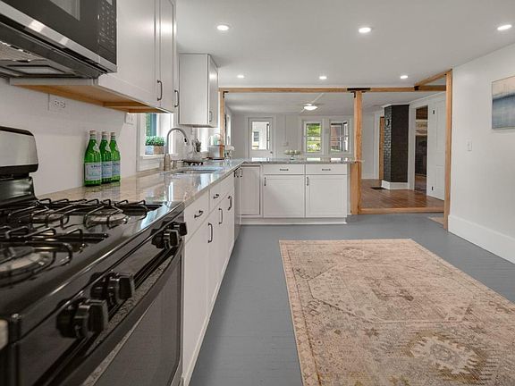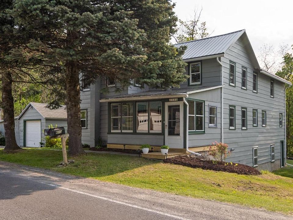 Located on a half-acre in the Trumbulls Corners area of Newfield, this 4 br 1 bath home is brimming with sunlight and high-quality renovations. The expansive kitchen is completely remodeled featuring granite countertops and stainless-steel appliances. Also in this category are the everything new full and half baths, accompanied by the new first floor laundry room off the kitchen. This house is spacious with great flow. The main floor has three large gathering spaces, exposed beams and a wood stove. Upstairs you will find four large bedrooms, all with good closet space and light. The house boasts both an enclosed front and screened back porch, both of which are large and brimming with farmhouse charm, a quiet backyard with babbling brook and fire pit, offering great opportunities to enjoy the outdoors. In addition, there is a one car garage plus additional outside storage space for your mower and outside toys. The large basement could be an excellent workshop area. This one is a gem!