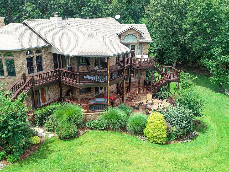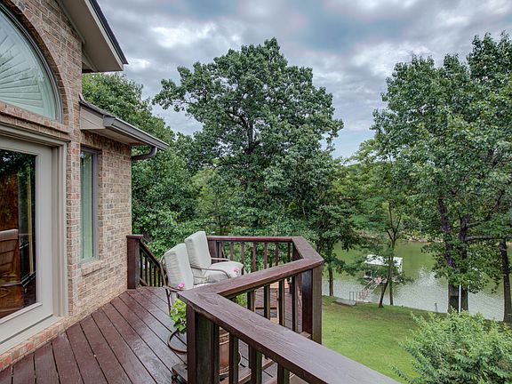 Approx 12.62 ACRES PRIVATE LAKEFRONT ESTATE WITH Approx. 762 Ft of GENTLE SLOPE SHORELINE TO YOUR PRIVATE DOCK. 10X20 slip. Great place for a pool. 1244 SF Shop/Garage detached shop building with 3/4 bath that would make a guest house. Deep water cove. You'll fall in love with this Magnificent 3 BD.,3.5 BA.+ office . 3348 SF brick dream home with lots of angled rooms and terraced redwood decks. Huge garage doors for large vehicles or boats. Solid wood floors and custom cabinetry. ANDERSON WINDOWS Huge laundry room. 2 fireplaces one up and one down. Indirect lighting. Bolt high speed internet .Ice maker. Shared Security Gate.