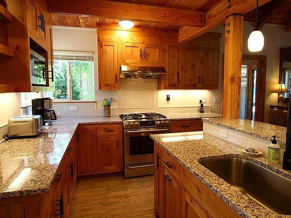 Prepare to be impressed with the extensive remodel of this lovely tri-level Agate Bay home. The kitchen is the new centerpiece, with granite counters, two stainless steel sinks, a breakfast bar, and custom alder cabinets, French Door refrigerator and a stainless steel gas range. The kitchen has spacious, well-equipped prep areas, two sinks and an adjoining bar that seats 3. The dining area is open to the kitchen and is perfect for entertaining. Just off the kitchen is a powder room, laundry area with new washer and dryer, and a second outdoor deck. Also on the lower level is the master suite with queen bed and gorgeous master bath with long, two-sink vanity and new tub-shower combo. Up a few stairs from the dining area is the great room with high beamed ceilings, all new carpet throughout, two leather sofas to snuggle in and watch the game on the new 55 " wall mounted flat screen TV. A wall of windows make this room light and inviting, and the perfect place to watch the snow fall. There is a another deck off the great room, for shady outdoor enjoyment on a warm day. Upstairs are two more bedrooms, each with a queen bed and airy high beamed ceilings. There is a second beautifully done guest bath with walk-in shower with pebble flooring.