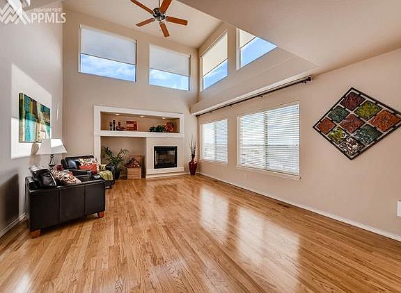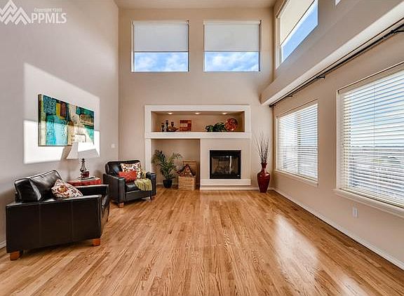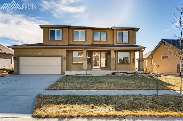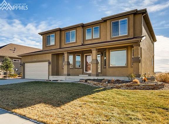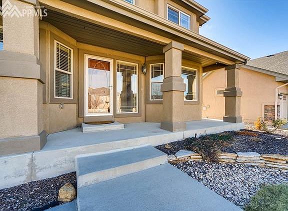 Stunning two story stucco home in immaculate condition. This home has loads of curb appeal from the beautifully landscaped yard, welcoming covered porch and spectacular Pikes Peak and Front Range views. Upon entering the home you are greeted with an open entryway with gleaming hardwood floors that flow through the main level. Dining or formal living room with bay window and arched entry, main level office with French doors, Great room with gas fireplace and built in entertainment center that opens to a gourmet kitchen with island, Electrolux stainless steel appliances, walk-in pantry, Butler???s pantry and walk-out to the flagstone patio to enjoy the breathtaking mountain views. A dramatic stairway leads to the upper level with a huge master suite with bay window, Pikes Peak views, double sided fireplace, sitting area, his and her closets and beautiful adjoining five piece master bath. Two additional bedrooms with double closets, a full bath and a second stairway leading back to the great room. Lower level features a game room, a spacious family room with gas fireplace, plus built-in entertainment center and a huge wet bar that separates the two rooms. Additional bedroom with an attached storage area and a full bath with heated floor complete the lower level. This home has it all: A/C, sprinkler system, drip system, walking path in the back that leads to a community dog park and community swimming pool. You won???t want to miss this one!!