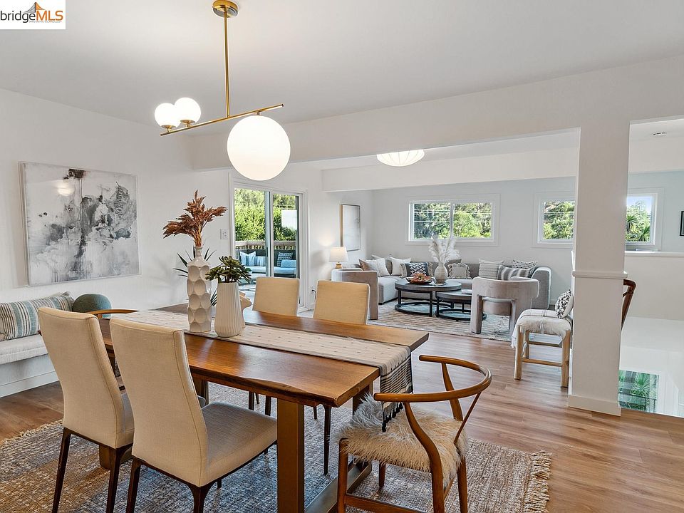 It’s just a short drive from Montclair Village to this tranquil house surrounded by trees. Enter through the yellow door to an office space, and then head upstairs to the open floor plan dining and living rooms with sliding glass doors that lead to a new wood deck (2023). The deck provides an easily accessible entertaining space with a peek of the Bay view on a clear day. Quartz countertops, stainless steel appliances, and plenty of cabinets create a well laid out kitchen. An additional sliding glass door leads to the back yard plus another outdoor seating area where you can enjoy dining al fresco. The house has three bedrooms, and one totally remodeled bathroom (2023) with designer tile and vanity with double sinks. New luxury vinyl flooring installed in all living areas (2023), except the bedrooms which are graced with original oak floors. Add to this a 2-car garage, and adjacent large, cleared lot with filtered bay views and great potential. Close to urban amenities, yet once you're home you'll feel a world away!