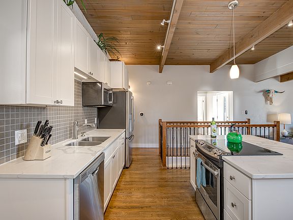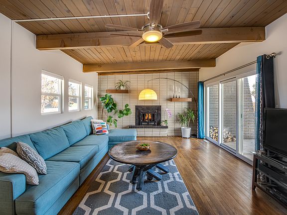 This handsome 4 bed/3 bath Mid-Century Modern home built in 1961 and revamped in 2017 tastefully harkens back to the 60s and delivers modern flair. Opulent light travels in from the windows and sliding glass doors, illuminating the chic tongue and groove ceilings, exposed beams, whitewashed exposed brick and refinished original hardwood floors, all of which promote alluring nostalgia and inspire dazzling décor. The kitchen boasts modern appliances, a myriad of storage spaces and a fabulous island spotlighted by low-hanging vintage-inspired lamps and inconspicuous lamps in the ceiling beams. A friendly dining room space hugs the kitchen and sits beneath bright windows that invite you outside to the backyard retreat, which is dotted with charming fruit trees. Its sweeping covered patio is primed for entertaining; its 14 handcrafted cedar raised beds are a gardener's dream, and a fully insulated garage is ideal for a hobbyist of any kind. This is a true iconic Mid-Century Modern splendor.