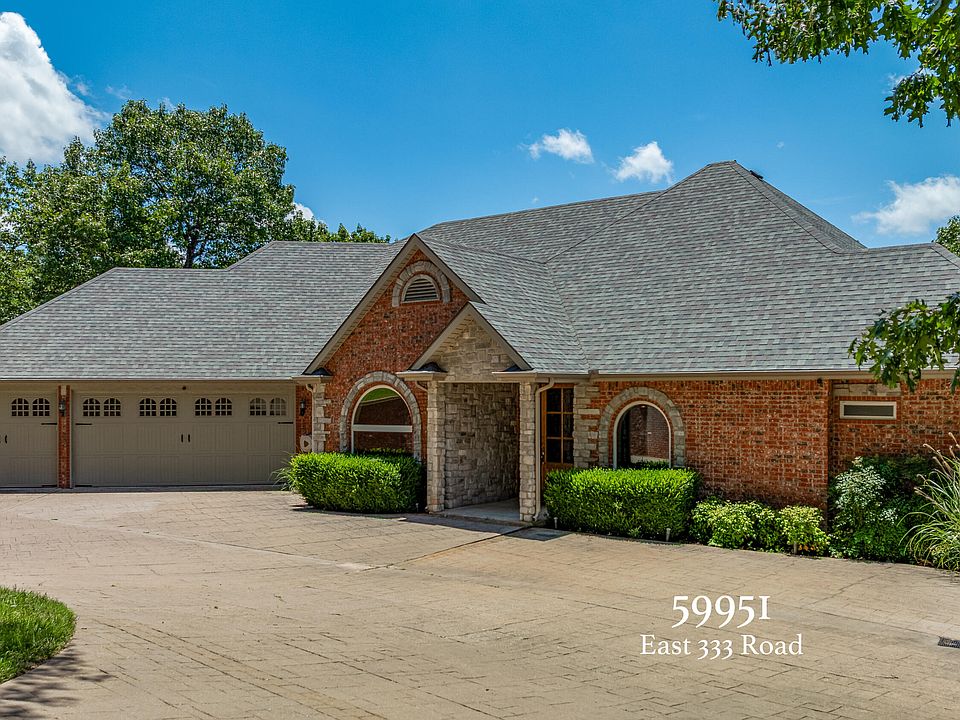 Fabulous 4,092± sq ft two-level luxury waterfront home on two lots in Governor's Retreat, Grand Lake of the Cherokees. Features 5 bedrooms, 4.5 baths, 2 living areas, and stunning lake views. Includes large 2-slip dock with boat lifts, auto covers, and a separate 3-car garage/apartment with golf cart bay and storage. Enjoy a new covered double-deck patio, fire pit by the water, and sunsets over the cove. Inside: luxury kitchen, lower-level kitchen with butler's bar & wine cooler, soaring ceilings, crown molding, and freshly painted walls. Primary suite has new carpet, spa bath, and walk-in closet. Safe room, fireplace, and heated driveway complete this incredible multi-generational lakefront retreat.