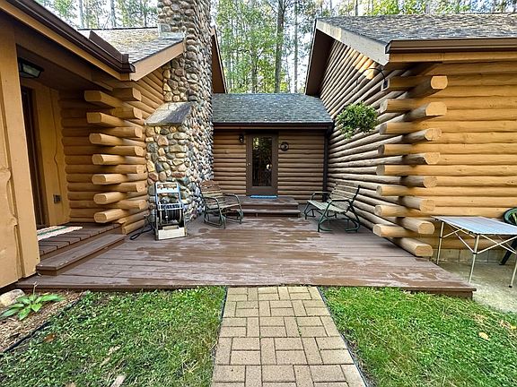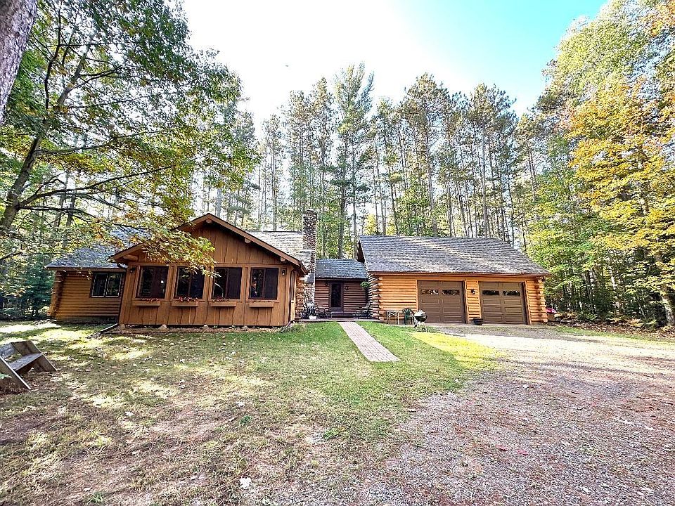 Peaceful Pines! Northwoods ambience at its finest. Here is your chance to live in a spectacular full log home situated on 2 1/2 acres in an area known for peace, tranquility and huge towering pines! This home is in close proximity to some of the best deep, clear lakes in Northern Wisconsin and also offers bike path, snowmobile trails within walking distance. Spectacular fireplace with custom carved mantle, new 4 season sunroom, newer roof and some of the most unique log home accents you will find anywhere. You have found peace in the middle of mother nature's finest gifts!