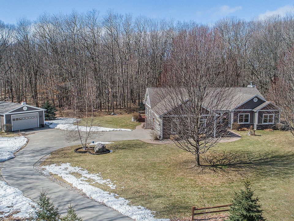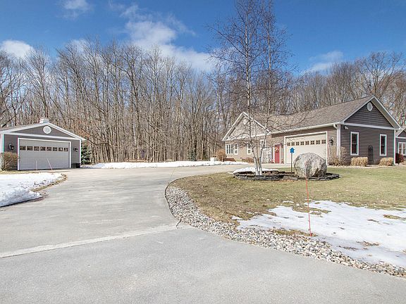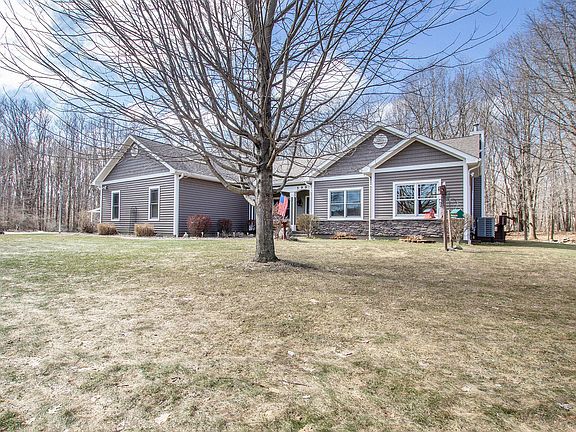 18 wooded acres - Lovely custom ranch style home w/attention to detail at every turn. Spacious open floor plan w/tile entryway, formal dining room w/tiger wood flooring. Casual dining area & kitchen w/granite island/breakfast bar, cherry cabinets, pantry, & built-in desk area. Cathedral ceilings in the living room w/exposed beams, stone fireplace (gas) & a wall of sliding glass doors for wooded views & access to the expansive deck. Master suite w/Jacuzzi tub, walk-in closet & access to the three-season room, and 2 additional bedrooms & full bath. Laundry room, 1/2 bath & mud room entrance from the 2-car finished, attached garage. Basement w/9ft ceilings - plumbed for bath. Paved driveway & detached 2nd garage/workshop. Generax Generator. Near Hamlin Lake, Lake Michigan, City of Ludington There are 2 additional lots to the south that can be purchased, if desired.