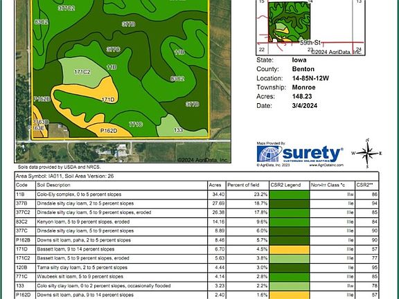 This is an attractive 152.00-acre, Benton County farm with an 85.10 CSR2. There are two machine sheds on the property that were built in 1940, one is 46' by 40' and the other is 24' by 50'. Primary soils are Colo-Ely and Dinsdale. See soil map for detail.