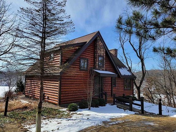 Tucked away on a 1.75 acre lot with mature pines and overlooking Apple Canyon is this stunning cabin at the lake. Generous space away from the neighbors with this one which offers nice seclusion. Approximately 90 ft of private shoreline & dock with Hewitt Boat Lift included. Shoreline improved with stonework adding spacious landings for seating and/or storage along with steps into the water. Home has gorgeous curb appeal which carries on throughout the interior of the home. Newer addition to the home includes a large living room with vaulted ceilings and adorned with gas fireplace and a built-in wine/coffee bar. A huge plus with this one is its inviting & remodeled kitchen with island seating. Mudroom behind barn style door offers laundry hook up, sink & built-in coat rack/storage cabinet. Also located on main floor is a spacious bedroom with wonderful views as well as a second half bath. The upper level delivers with more sleeping space with two bedrooms, each with beautiful lake views and a full bath. Garage/storage space under is excellent for storage of lake toys &/or vehicles or could make an excellent workshop space (12'6 deep X 25'3 wide). Charming exterior space with this home. Covered back deck with access from kitchen &/or main floor bedroom offer gorgeous southern views of the mature trees and landscape with lake just beyond. Covenants & restrictions apply. Annual dues & fees apply.