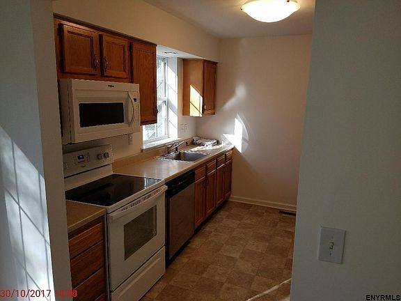 Newly refurbished 2 bed 1.5 bath town house rental in the Town of Bethlehem. Spacious combined Dining/Living area w/ new carpet and wood flooring. Energy efficient gas hot air heat and Central A/C. W/D hookups in private basement.Direct access 1-car garage w/ opener and extra off street parking. New appliances include range, dishwasher, microwave hood, disposal and refrigerator. Large closets and ample storage. Private/Wooded cul-de-sac and Central location. Bethlehem schools. Call agent for a showing