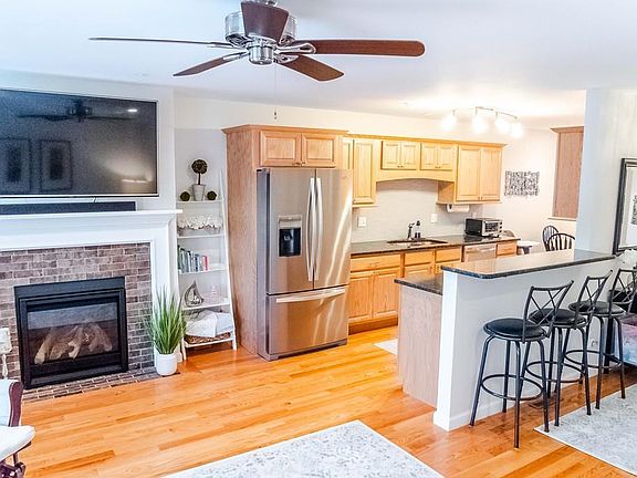 Mapleview Commons may intrigue you, but the modern style and elevated details of this new condo will convince you! What's not to love about a low-maintenance home with an open floor plan, wood flooring throughout and upgraded lighting and tiling? While the development continues to grow, this condo (built in 2016), is already established and move-in ready. Welcome guests into the living room with brick fireplace for ultimate ambiance. Gather friends for appetizers around the kitchen's center island with seating. A sliding door to the backyard lets in ample natural light, and a nearby powder room offers added convenience. Get a great night's sleep in either bedroom, both located upstairs with the full bath. Enjoy second floor laundry or home office; hook-ups in the basement give you the option. A condo fee covers maintenance, saving you from heavy lifting outside - key during New England winters!