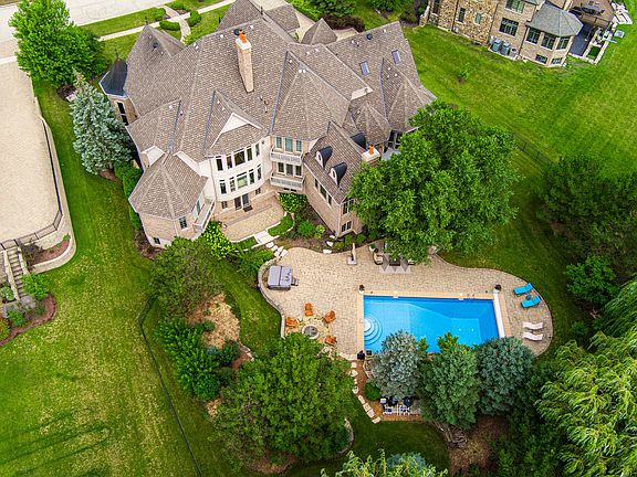 Welcome to 5N155 Prairie Rose Drive, an exceptional luxury home in the beautiful Prairie Lakes community of St. Charles, Illinois. Set on a private, meticulously landscaped lot with unparalleled lake views, this custom home blends timeless craftsmanship with modern elegance, ideal for buyers seeking high-end living in one of St. Charles' most desirable neighborhoods. Inside, soaring ceilings, exquisite millwork, and updated flooring (2023) elevate every space. The gourmet kitchen features high-end appliances, gorgeous flooring, rich cabinetry, and an inviting eating area that flows directly to the screened-in porch and expansive deck. A first-floor bar seamlessly connects the great room and formal dining room, creating an entertainer's dream layout. A private first-floor bedroom with full bath and balcony overlooking the pool offers the perfect in-law or guest suite. Designed for everyday convenience, the main level includes two well-placed half bathrooms, two thoughtfully designed mudrooms with direct garage access, and a spacious first-floor laundry room. The home office is a standout, showcasing custom millwork and floor-to-ceiling windows, ideal for remote work. Upstairs, the luxurious primary suite includes a private balcony with lake views, a wet bar with wine refrigerator, a beautifully designed custom closet, and a spa-inspired bathroom with a stunning mosaic-tile shower. For ultimate functionality, the primary suite also offers a private second-floor laundry room. All additional bedrooms offer walk-in closets and private en-suite baths. The walk-out lower level delivers true resort-style living with heated floors, a full bar, private theater, wine cellar, and multiple recreation areas, plus direct garage access for ultimate convenience. Outdoors, the stunning pool becomes the centerpiece of the backyard, perfectly positioned to capture tranquil lake views and create a true luxury-resort atmosphere. Located in highly rated St. Charles District 303, this home offers convenient access to top private schools, parks, trails, golf courses, and the vibrant downtown St. Charles dining and boutique shopping scene. Significant updates include three newer HVAC units (2023), two water heaters (2019), fresh interior paint, and a newer pool filter (2025). This Prairie Lakes estate offers unmatched luxury, privacy, and lifestyle, an extraordinary opportunity in the heart of St. Charles.