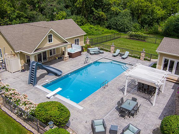 Welcome home... to this gorgeous estate set amidst multiple acres of beautiful landscaping and an impressive private wooded lot with soaring mature trees. Truly a magnificent custom home with over 7,500 square feet of finished living space, built with uncompromising quality and high attention to detail. Enter through the gated entrance to your very own paradise. Gain access to the home through the beautiful arched double front doors into the foyer which is flanked by a stunning dining room and first-floor office. The dining room features wainscotting and a tray ceiling, making the perfect space for entertaining on a grand scale. The office will leave you in awe, boasting custom built-in cabinetry with soft close features, a large center island with a built-in desk with additional seating, and large windows throughout allowing for an abundance of natural light and views of the beautiful landscaping. From there, you enter the stunning kitchen with gorgeous furniture quality cabinetry, an expansive island that offers additional seating, and high-end stainless-steel appliances including a wine refrigerator, a Thermador refrigerator and freezer, and a Viking oven/range. The grand family room features a stone fireplace surrounded by built-in bookcases, stunning beamed ceilings with crown molding details, and large windows overlooking the resort-like grounds. The hearth room with fireplace and large windows leads you to your GORGEOUS private oasis. Outside you are welcomed by the outdoor kitchen with a built-in grill and refrigerator. You will also enjoy a fire pit, a fabulous inground pool with a slide, an automatic floor cleaning system and automatic cover, an outdoor shower, and an extravagant pool house! The stunning pool house features cedar planked walls and vaulted ceilings, a full kitchen, family room, as well as, a full bathroom. This expansive pool house also has a garage space! The home's second floor boasts more charm and amazing details in the luxurious master suite featuring a see-through fireplace, sitting area, and a dramatic ensuite with gorgeous dual vanities, makeup vanity, double shower with detailed tile work, a bidet, and dual walk-in closets with ultra-custom built-ins, and a large luxury tub. The additional spacious bedrooms feature their own full ensuite bathrooms and walk-in closets. A sitting room and large laundry room round out the second floor. The dramatic FINISHED basement offers spectacular finishes and attention to detail offering a sizable wet bar with custom cabinetry, a billiard's room, an exercise room, a large second family room with a stone detailed fireplace, a media room, and a laundry closet with a washer and dryer. This amazing lower level also boasts an indoor basketball half-court with a ceiling height that will meet the expectations of all athletes! Enjoy the four-car garage with custom built-in for dog washing along with a fenced-in area for dogs. Radiant heated floors are featured throughout the basement, pool house, and the four-car garage as well as a whole home generator!! Livable luxury is yours in this incredible residence...making this the dream lifestyle home you've been looking for! Schedule your private showing TODAY!!