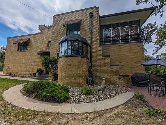 Inspired by Frank Lloyd Wright built homes! Enjoy the tranquility of nature while in town---in this quality built, Prairie-style home features a unique, welcoming design as well as the original parquet hardwood floors, real wood doors/trim, and plentiful built-in storage. On the main floor you'll find an eat-in kitchen with a view, large dining room, and expansive first floor living room with brick fireplace. Just outside are two separate patios. Upstairs are 3 large bedrooms with generous closet space. Watch the wildlife from the sunroom. Downstairs is a second living room with a stone fireplace, a spacious laundry room, and office space with slate floors and utilities including a new boiler installed in Dec. 23 are and a breaker box. Nestled above the river, this home's beautifully wooded 1.7 acres features a charming cabin with a fireplace and a patio with an outdoor fireplace. Whether you enjoy the solitude, have a family in need of more space, or love to entertain; this home can suit your needs. Concrete walls with brick exterior. The attached 2 car garage is heated. This home has been meticulously maintained by the same owner for over sixty years. Buyers take a look at this quality home and know that most of the furniture is negotiable.