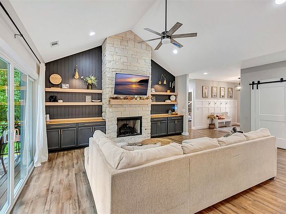 High quality finishes and attention to detail are everywhere. The exterior features Craftsman era styling, while the interior is farmhouse chic, with square casings around doors and windows, crown molding, and built in bookcases. The kitchen boasts beautiful quartz counter tops, a large island, and ample cabinets. The appliances are stainless steel, with a built-in microwave and wall oven, and an induction cook top. The kitchen, breakfast nook, and living room are open to each other, and the living area flows out to the deck, covered by a vaulted, tongue and groove accented roof. The living room features fantastic built-ins on either side of the stacked stone fireplace, and its vaulted ceiling makes the space airy and happy.