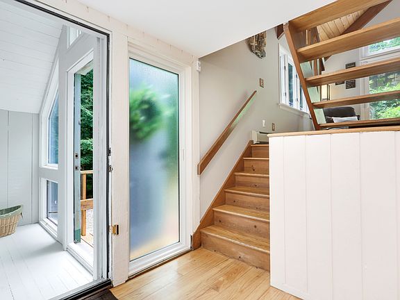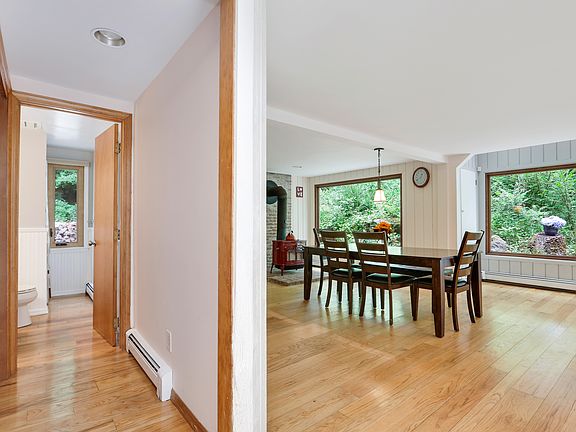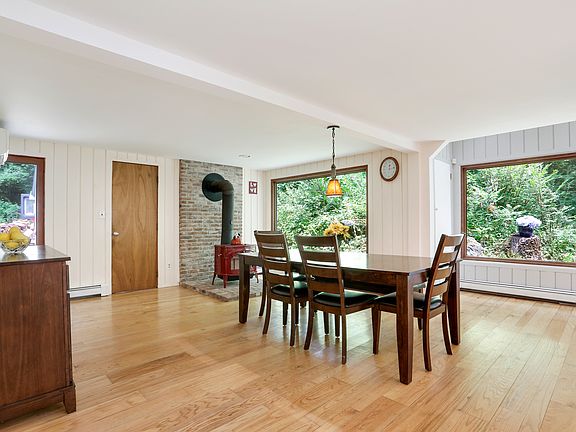 Dramatic contemporary in impeccable condition with a very comfortable flow. Entry foyer leads to eat in kitchen with sky lighted vaulted ceiling/ exposed beams/ custom cabinetry/ center island/ glass doors/ w/6 burner gas cook top w/drop down vent. Open floor plan to dining area with wood burning Vermont Castings stove. Expansive family room w/vaulted ceiling/ fireplace/sliders to 10x 18 deck overlooking wooded landscape. Interior balcony leads to master bedroom with large bath/ walk in closet & dressing or office are/ sky lighted vaulted ceiling. A few steps off the kitchen to a versatile solarium space, an enchanting spot for botanical pursuits or a casual sitting spot to enjoy the changing seasons. Two bedrooms on this wing with a hall bath. The lower level offers a part finished exercise/rec room & storage space. Throughout the house are gleaming random width hardwood floors & walls of windows to bring the outside in. 100K of recent improvements of newer roof/ windows/ 10KW Standby generator/ split unit heat pump-Living & Dining Room- electric heat split unit Master bedroom & bath-cooling split heat pump living & dining room. Heat cost 2k/year. Two car carport under house. A very private gorgeous wooded landscape with majestic stone outcroppings affords a maintenance free setting. Perfect family home or weekend getaway. One hour to NYC. A Must see.