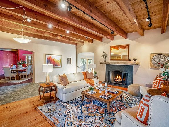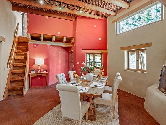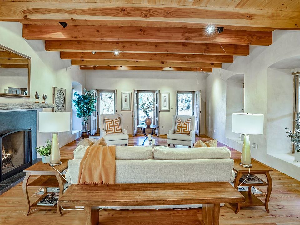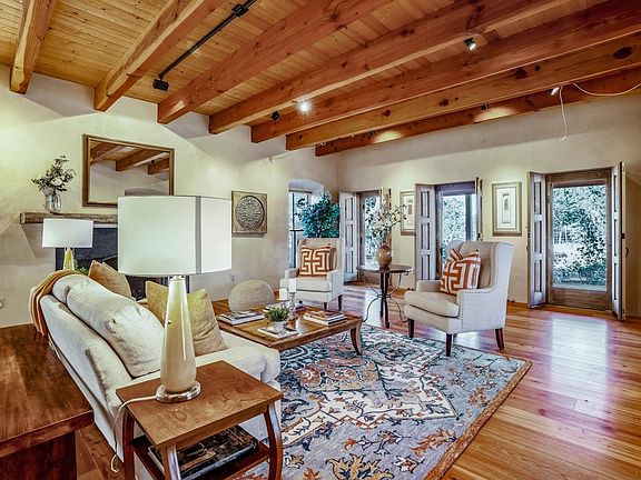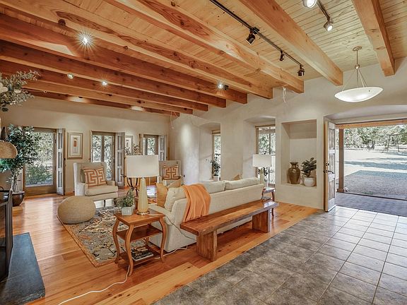 Serene, rural home built in true Santa Fe style. Walk into a gracious living room with beautiful fireplace, high beamed ceilings and 3 lovely artistically designed doorways that take you out to the large covered wrap around portal. Ample dining room boasts lovely kiva fireplace and takes you through to the functioning greenhouse, which then leads to the chef’s kitchen - with beautiful caesarstone composite countertops, farm house sink, large useful island and a terrific Vulcan commercial oven/range. The master suite has lovely wood floors, large master closet and a wonderful master bath with footed tub, bidet and separate walk in shower. Second downstairs bedroom is beyond the kitchen, through a small studio area and has an adjacent spacious 3/4 bath. There is also a small bonus room up a steep staircase that could be office or reading nook with windows all around! Flooring throughout includes tile, concrete, wood, brick and flagstone. Main house room open to a lovely enclosed back yard that is private and serene, surrounded by healthy piñon/juniper creating a feeling of solitude. Walk out thru the garage and open the door to a back covered portal with a secret garden! Beautiful and appealing, this leads you to the guest house with 3/4 bath & lots of light, making it useable as guest house or large studio. 4000 gallon underground cistern can be used for landscape watering, and the house has storage galore —all this on 2.5 acres in a country setting not far from town!