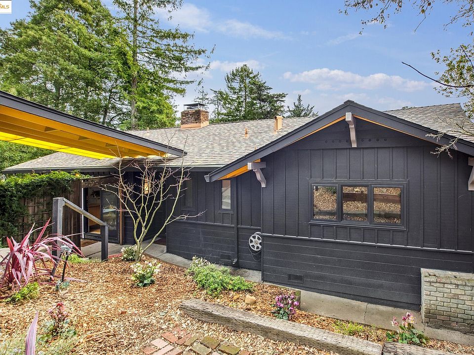 Nestled in coveted Piedmont Pines, this eclectic Mid Century Modern residence awaits discerning homeowners. Spanning 2,050sf with an expansive 9,564sf lot, 6 Ascot Lane offers a harmonious blend of classic charm and contemporary updates. The main level boasts three well-appointed bedrooms, including a serene en-suite, and two tastefully remodeled bathrooms. The seamless flow of hardwood and cork flooring complements the grandeur of vaulted ceilings and large windows, inviting natural light to fill the space. On winter nights, the double-sided wood-burning fireplace adds warmth to the living room and eating area. A spacious wooden deck extends the living area outdoors, & the gentle sloping, fenced lot provides ample space to explore. The kitchen invites personalization, whether maintaining its retro allure or introducing modern flair. Downstairs, discover a versatile space featuring a bedroom, bathroom, and a generously sized family room with a separate entrance—ideal for potential in-law accommodations (subject to city approval). Situated on a quiet cul-de-sac with partial bay views, this house is a gem. Sewer compliant and move-in ready. Being sold with adjacent vacant lot, which is wooded and full of fruit trees that explode in blossoms every spring. MLS# 41085795