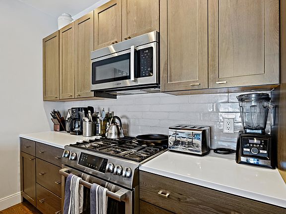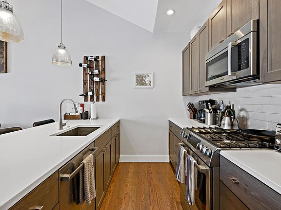 Stunning luxury Clam Point property with soaring 15' high ceilings. This large 2 bedroom and 2 full bath home is equipped with a sun-drenched kitchen outfitted with custom European frameless cabinets, Quartz counters, and top of the line Bosch appliances. Features including custom stained oak floors, Nest thermostats, Navien instant hot water heater, 4 zone Russound system, gas fireplace, laundry room in unit, primary bedroom bath with radiant heated flooring and DualMax toilets, slider leading to private deck, West Elm decorative lighting and 4 in. LED HALO recessed lights throughout. The home offers heated garage parking and a community room on-site.