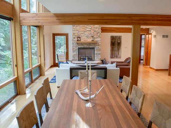 Dune Acres at beautiful Lake Michigan. Live, work, play in your own Sanctuary. Peaceful retreat just 45 miles from Chicago. Elegant yet casual custom post & beam "Deck House" was inspired by the adj hundreds of acres of National Parkland. The home's blend of warm wood & natural stone creates a strong connection to the wooded dunes landscape. Open floor plan with soaring ceilings, hardwood floors, a wall of windows to view the wooded sanctuary with changing colors of the seasons. Open gourmet kitchen with granite tops overlooks family room with 2 story stone fireplace, spacious dining area and intimate screened in porch. Two guest bedrooms with full bath. Stunning master suite with loft/den, luxury bath, laundry, and a private outdoor balcony. Lower area has Media room, fireplace, half bath, workout room, storage and the attached 2 car garage. Radiant heated floors throughout. Deck. Terrace. Accented with perennial borders, flowering dogwoods and natural landscape. Just a 3 minute walk to private white sandy beach. Tennis courts, play ground, walking/bike trails and more! Just minutes away from shopping, restaurants and outlet mall.