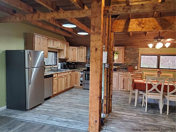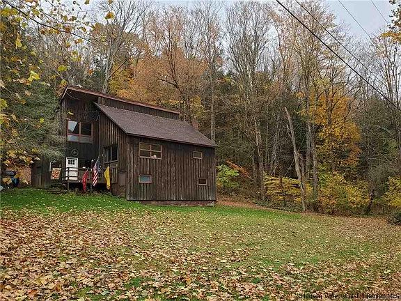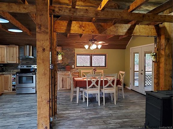 Post and Beam Barn conversion, unknown the true age, but thought to be before 1900, it was converted in the 1960s, renovated 2020 with open concept, high wood ceilings, exposed beams, nice stone work. A home office on the 1st floor with sliders to the screened back porch. 1st floor Bath has sliding barn door, beautiful stone and wood walls, glass shower doors. Large eat in kitchen with a alcove area that is home to the woodstove. French doors with built in blinds that lead to screened porch. Short stair case to 2nd level living room which is open to the 1st floor creating a balcony, two bedrooms on this level, up to the full large bath with ceramic tile, double vanity, skylight tub/shower. Another level has the 3rd large L shaped bedroom with skylight front windows overlooking deck, storage, 4th bedroom with storage closet under eaves, storage area at top of stairs too. Basement is home to the laundry, furnace, and hot water heater. The property is on a corner, with a stream bed between the property and the road.