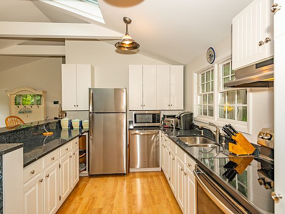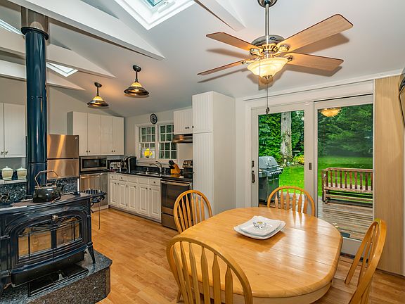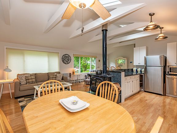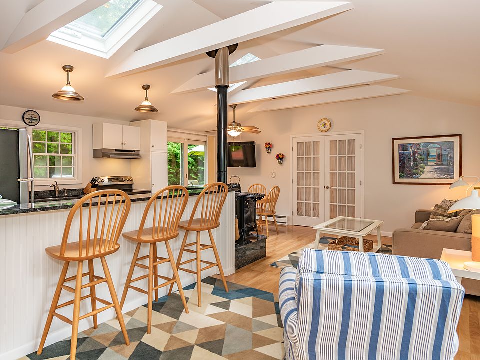 Newly renovated three Bedroom two bathrooms is just 1 1/2 blocks distance to the Peconic bay beach. This home offers beautiful cathedral high ceilings, with skylights throughout allowing the sunlight to shine inside the house. A large master bedroom with a separate additional sitting area (Den) used as another bedroom it has a sizeable sofa that turns into a queen-size bed. The bathrooms have been renovated and have skylights, and the laundry room has a full-size washer and dryer. There are air conditioning units in every room, a charming wood-burning stove. The property has a hot tub, outdoor shower, a large deck with a full-size grill, lounge chairs, and tables, and you also have private beach access and cable & mooring rights.