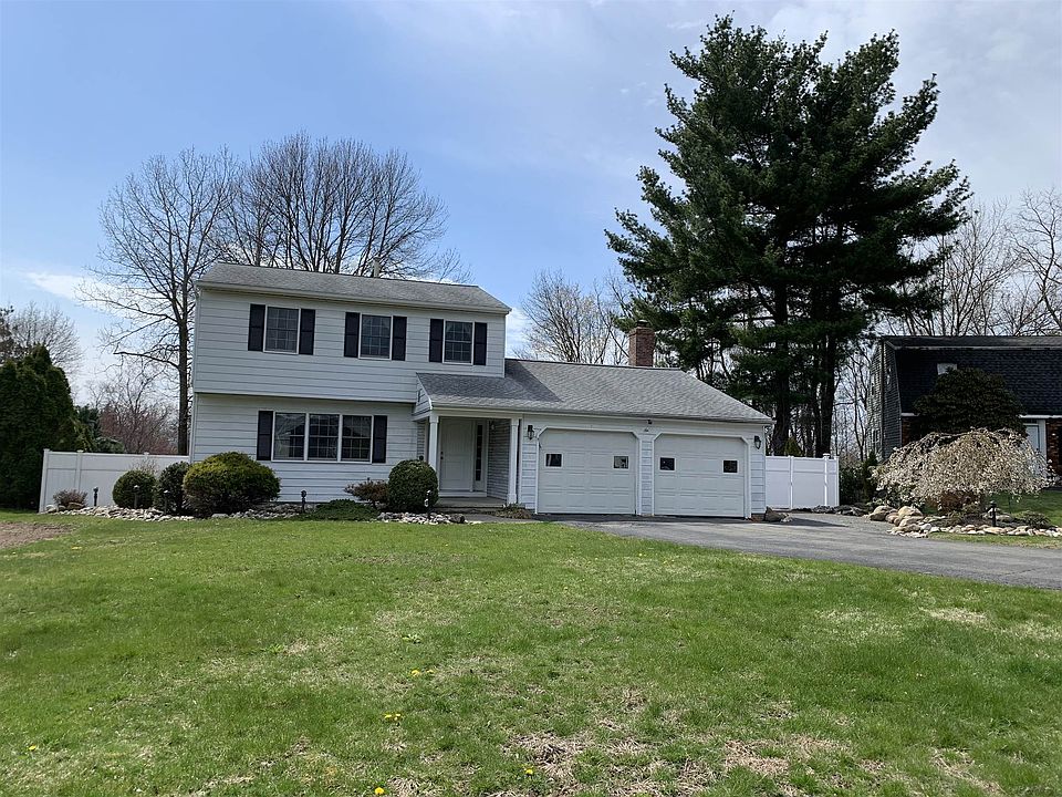 Enjoy peaceful cul-de-sac living! Prepare a summer meal on the gas grill in the fenced backyard or cozy up next to the stone fireplace and watch the snow fall from the open living room in the winter. The fully finished basement is equipped with TV and gaming mounts for extra living space or can become separate guest space with half bath and private room with sliding barn door. Recent upgrades include new water lines, electrical service, gas lines, wiring/lighting inside and out. New refrigerator and 1-year old dishwasher. Hardwood stairs and floors on second level. New front entrance. Hardwire smoke alarms. New paint throughout home. Compost decking, vinyl shed in backyard. Taxes do not reflect STAR. Security cameras not included.