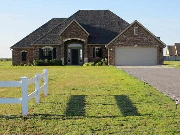 Beautiful home on 3 acres! This 2100 SF 4 bedroom, 2 bath home has gracious features such as a welcoming foyer, gas fire place with a beautiful wood mantel and hardwood floors. The kitchen offers granite countertops, custom cabinetry and a large pantry. The master suite is an over-sized room with a double tray ceiling, a large walk-in closet with multiple built-ins, a separate tiled shower, 6 ft oval-shaped whirlpool tub and a custom double vanity with granite countertops. The 2nd and 3rd bedrooms are large with spacious closets. The guest bath also features a custom vanity that is gorgeous! Enjoy your evenings on the large covered patio that is perfect for entertaining! This home is a must see if you are looking for a custom home with 3 acres! Call Kim Thomas for your tour, 580-704-9916.