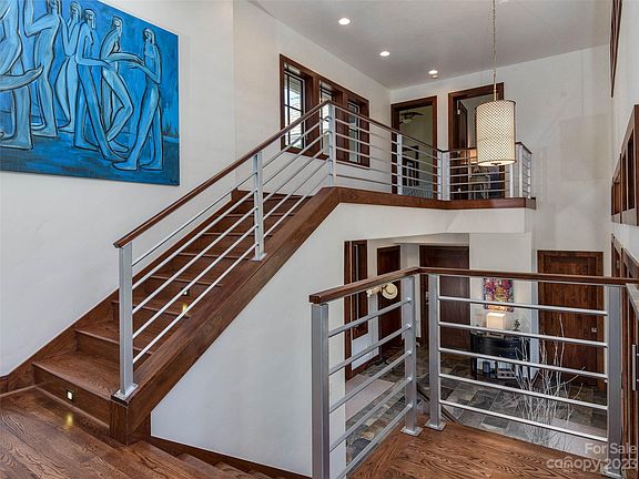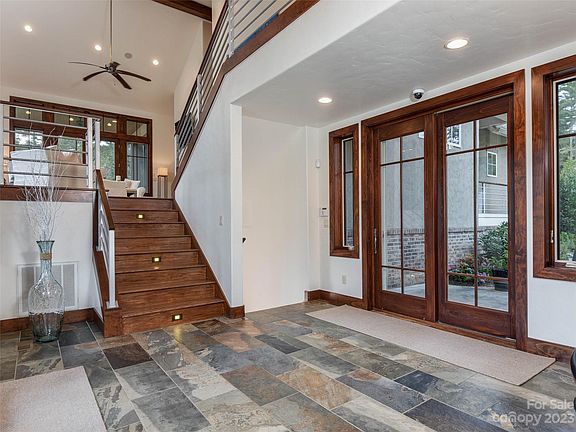 Welcome to this beautiful contemporary designed quality custom home with flowing open floorplan and an abundance of natural light. The perfect mix of crisp, clean lines and comfortable warmth. A large inviting covered front porch leads to the beautiful entry foyer with tall ceilings spanning two levels. Spacious primary on main has vaulted ceilings with wood accents. Chef’s kitchen with custom cabinetry and island opening to dining and living spaces complete with a see through, 2-sided fireplace to enjoy! Two bedrooms on the upper level each with ensuite baths. The terrace level has another bedroom with bath. Wonderful outdoor living on the porches and private side patio and sitting area overlooking the flat grassy yard-perfect to romp and play! Cozy four seasons room as well. Access to the walking trails is just across the street. Located in the heart of the coveted gated community of The Ramble of Biltmore Forest nestled among 1,000 acres of preserved forest and peaceful trails.