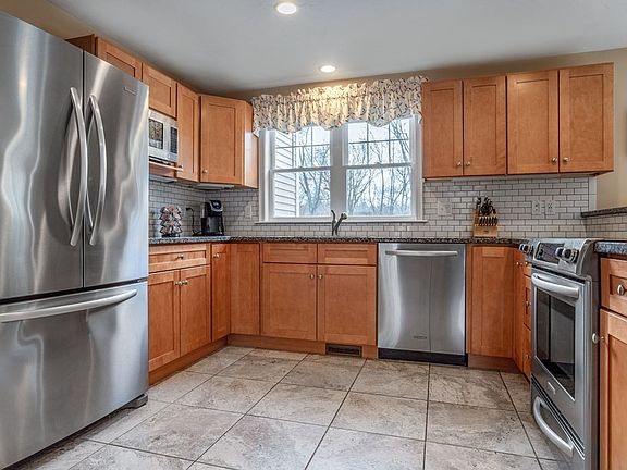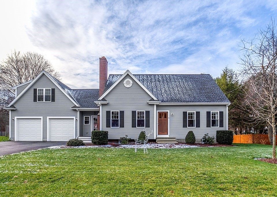 Charming home with great curb appeal, completely renovated in late 2014. This sun-filled 4 bedroom Cape style home is nestled in a quiet neighborhood minutes to major commuting routes, MBTA station, schools, shopping and restaurants. The two-car garage and mudroom were added in 2014. First-floor master bedroom/bath with walk-in closet! The first floor also features an open floor plan, hardwood floors, a remodeled kitchen with stainless appliances, a separate dining area & a cozy fireplaced living room. Upstairs you will find two generous-sized bedrooms and both with walk-in closets! Other special features of this home include a large bonus/bdrm room over the garage, Geothermal heating/cooling (very energy efficient! Annual heating $650/yr.), spray foam insulation, newer roof & windows, irrigation system, central vacuum, updated 200-amp electrical and an additional 455 square-feet of beautifully finished basement. Gorgeous landscaped level lot with composite deck, large shed & fire pit.