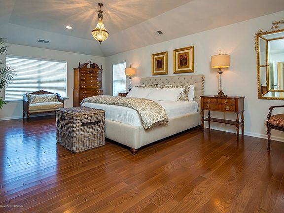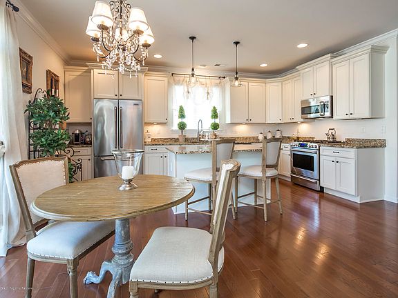 Immaculate Nantucket Country Manor Colonial tastefully appointed Bright Open floor plan in Cottage Gate. Features 9' ceilings, recessed lighting, hardwood flooring thru-out, dec molding, eat-in gourmet kitchen, center island w/granite counters, upgraded cabinets, slider to over-sized deck. 2 story entry streams natural light. Two columns open to living and dining rooms w/2 chandeliers. Family room with gas f/p, hardwired tv's. Spacious Master en suite includes wall tv, tray ceiling, luxurious bath w/double sinks, lg soaking tub, separate shower & walk in closet. 2nd Fl Hall Bath has sep shower/tub room. Full finished Walk Out basement with full bath, storage room & lg closet. Great Location! Minutes to ferry. Close to Shore Beaches. Luxury Living in desirable Navesink Area!
