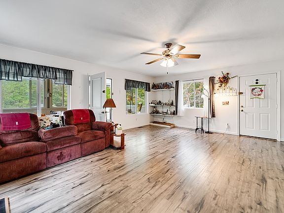 This home is privately located at the end of the road and backs up to beautiful and peaceful Forest Service. The front deck leads into a large living room with the kitchen and bedrooms to the left and an incredible four-season room off to the right. The sunroom boasts walls of windows and a spectacular winter view. With some clearing or tree topping, an additional view could be added. A large dining room opens to the kitchen, with a breakfast bar in between. The bedrooms are located off the kitchen/dining room, with a guest bath in between. The primary bedroom has a walk-in closet and an en-suite bath. The kitchen accesses the laundry room/pantry with a door to the back screened-in deck. Fenced side yard perfect for your garden or pets with an outbuilding for additional storage or garden tools. Large detached 2-car garage, and a propane-heated workshop for all your toys, crafts, added storage, and vehicles. This home is located in a private setting with the ease of stores nearby. Located centrally between Franklin and Highlands.