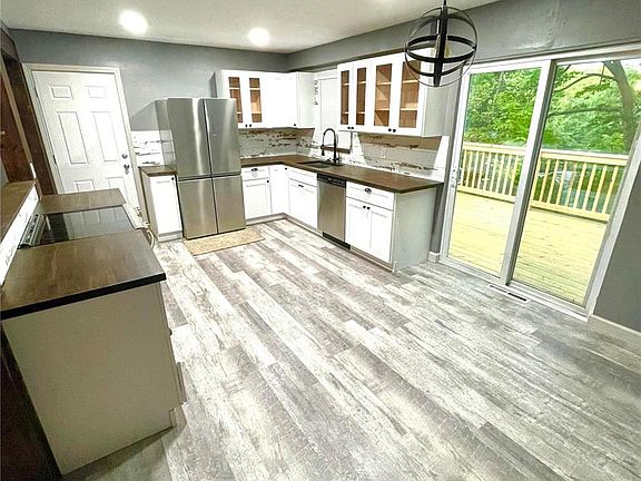 This contemporary country farmhouse styled ranch is the perfect place to call home & enjoy living on your own private cul-de-sac. Your new home will be the top of conversation once your guests step into your home & see the open concept kitchen/living area. All is framed by the wood beams to the custom kitchen that showcases the breakfast bar/island with butcher block countertops, a coffee bar, SS appliances, including a French 4 door fridge, smooth top range & DW, deep farmhouse sink with additional features, vinyl plank floors, sliding doors leading to the deck, perfect for relaxing, & the sliding barn door leading to the partially finished walk out basement. All 3 bedrooms offer wood floors, 6 panel doors & ceiling fans for extra comfort. The bath offers ceramic tile floors & tub/shower enclosure along with a jetted tub. If you like to entertain, this is the home for you. Other features of this home includes, solar lighting, newer roof, a high efficiency HVAC system & water heater.