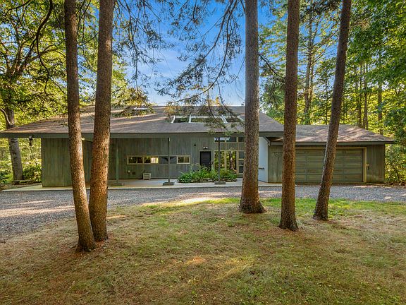 Unique Mid-Century Modern opportunity. Elevated on an embankment above Mare Brook above cascading rhododendron, azalea and forsythia, the home features expansive floor-to-ceiling windows that look onto an open air rockwork garden and mature woodlands. The four bedroom house captures the best in clean-line modern design and supplies ample storage space. The open concept buffet style dining room and elongated galley kitchen are well suited to casual or formal dining with a built-in display cabinet and accordion counter level divider. The conjoined living room includes a wood burning fireplace and period tile hearth. The sound proofed, intentionally darkened study has a spacious desk and is an ideal modern work space that also opens to the outdoors. The home is surrounded on three sides by a cantilever deck and fronted by a sheltered patio that is flanked by a two-story garden shed and two-car garage. With hardwood floors scattered throughout, the heart of the home is connected by a hand-crafted multi-story open staircase. The finished lower level has an unobstructed view of the gardens. Recent renovations included an updated heating system set in a dedicated workroom and a newly installed automated propane Kohler generator. A short distance to Bowdoin College and Downtown Brunswick, this true Mid-Century architecture opportunity is set back from the street on a wooded circular drive, but also nestled in Meadowbrook, one of the Brunswick community's favorite neighborhoods. Designed by the current owner's family, this home has been lovingly cared for and conserved by one family.