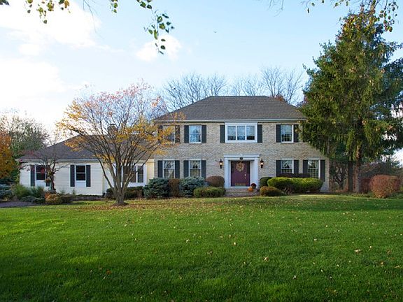 A prime location on a quiet cul de sac street presents a tranquil setting for this elegant brick front Colonial on 3.03 open and level acres in Readington Township. Manicured lawns, mature trees and park-like landscapes abound on this captivating property, where an entertainment-size rear deck takes in the compelling natural views. Inside, an exquisite nine-room floor plan offers four bedrooms, two full baths and a powder room as well as an attached two-car garage. Highlights of the flowing layout include oak hardwood flooring throughout the main floors gathering spaces, high ceilings, skylights, neutral paint colors, six-panel doors, numerous closets fitted with built-ins and an updated gourmet kitchen. A landscaped paver stone front walkway leads to the impressive front door entrance edged by sidelights. The wide entrance foyer makes a positive first impression with ceramic tile flooring, a turned wooden staircase and two double door coat closets. Leading from the foyer are some of the principal rooms including spacious living and dining rooms fitted with oak flooring and large windows featuring wood blinds. Rear-facing rooms make up the heart of this impressive home. Updated by Zook Kitchens in 2009, the gourmet country kitchen is designed with knotty alder wood cabinetry, under-cabinet lighting, granite counter-tops, a Shaws Original farmhouse sink, beaded board backsplash, recessed lighting and oak flooring. Top-of-the-line stainless steel appliances include the GE Professional Series five-burner gas stove and microwave, a Bosch dishwasher, plus a wood-paneled KitchenAid refrigerator/freezer. The kitchen opens into a sunny dining area with hardwood oak flooring and a triple window bay. This open flow continues in the adjacent family room featuring beamed cathedral ceilings fitted with two skylights, a floor-to-ceiling brick, fireplace with gas logs and a remote electric starter, and a set of sliding glass doors to the entertainment-sized deck. The first floor also offers a handsome den with four-foot beaded board paneled walls, a design element also seen in the 2009-updated powder room and stylish laundry room. Upstairs are four carpeted bedrooms with ample closet space. The master suite is arranged with a bedroom offering a walk-in closet fitted with wardrobe organizers and an adjoining master bath. This two-part bath has a separate mirrored makeup vanity with a sink, a jetted platform tub, stall shower, skylight and second vanity. A spacious hallway bath with double sink wood vanity serves the secondary bedrooms. The unfinished lower level and attached two car garage provide a variety of storage options. Especially noteworthy are the surroundings of this home; the pressure-treated wood deck is tiered and has steps leading down into the lush backyard. A stainless steel barbecue grill features a built-in gas line for effortless grilling. From the slightly elevated deck are views of the property's locust trees, a charming flower and vegetable garden enclosed by picket fencing, and a convenient storage shed. Built in 1986, among the many updates are a new roof installed in 2010 and a renovated kitchen and powder room in 2009. This inviting home is served by forced hot air natural gas heating, central air conditioning, a humidifier, generator hook-ups, a 2013 natural gas hot water heater, underground utilities, private septic and well water with a newer pump. While it enjoys a peaceful countryside setting, this Colonial is also convenient to Flemington, Routes 78, 202 and 31, shopping, dining and Round Valley Recreation Area. Readington Township in Hunterdon County encompasses a number of small villages and hamlets, with many buildings listed on the National Register of Historic Places.