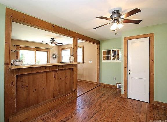 Rustic features galore in this charming cape cod home! Exposed brick, wood beams, stone fireplace and hardwood floors to name a few. The house features a large living room with fireplace, eat-in kitchen with slider to back yard, a den off the kitchen which can also be used as a dining room, two bedrooms, office and an updated bathroom. There is also an extra 481 sq ft of living space (not included in sq footage) in the finished basement which could be used as a family room. New vinyl siding, newer roof and windows, central air. Walk-up attic offers expansion possibilities. Great location! Walk to downtown restaurants, shops and train. Close to Route 1, Merritt parkway and I-95.