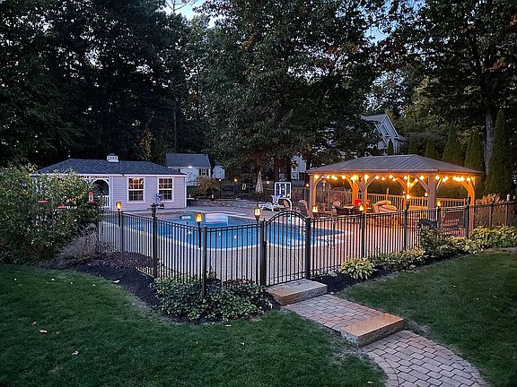 Stately 4 bedroom colonial in Brushwood Estates. All the amenities you could want! Fabulous kitchen w/pickled maple cabinets, SS appliances including 6 burner commercial stove & exhaust hood, granite counter tops in kitchen & baths, formal dining w/crown molding, French doors lead to formal sitting room or office, spacious family room with floor to ceiling brick hearth & FP w/pellet stove insert, walk-in pantry, 3 season sun room, 2nd floor laundry room, master bedroom w/deep whirlpool tub, double sinks & separate shower, finished basement with gym, irrigation system, central vac, new well pump (2020), new water treatment system (2020), leach field redone in 2016. Topped off by a beautiful 20x40 inground heated salt water pool with massive patio space and a pool house with screened area for sitting and a closed section for changing or watching baseball. 12x20 cedar gazebo with metal roof installed in 2022. Basement remodeled in 2022 to provide a lounge area and fitness center.