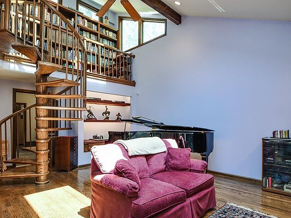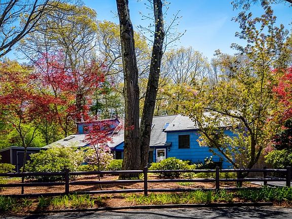 Spacious unique 4 bedroom updated contemporary home in a private setting on a cul de sac abutting Oakvale Park.Familyroom w/ hardwood,skylights,cathederal ceiling,recessed lights,high quality brick firepl,and spiral staircase leading to a library.Kitchen has new stainless steel appliances and countertops,tile fl,w/adjacent dining room /sliders to a deck.First fl office w/ bookcase,ceiling fan,and laminate flooring.Formal Living room w/berber carpet.Two bedrms w/wall to wall and the bedrm on the lower level has an adjacent full bath w/shower and tile floor.Second level bath w/tub and shower,tile fl,and linen closet.Very spacious Master Bedroom w/wall,walk in cedar closet,skylights,ceiling fan,w/open spacious multipurpose room.Other features include ADT security system,2 new oil tanks,2 zone sep heat units,screen house,new driveway,finished basement rec room w/ new flooring/bookcase,sep laundry,2 new sheds,salt water spa,lovely fenced yd and beautiful flowers/ abuts conservation land.