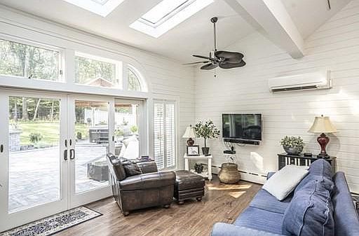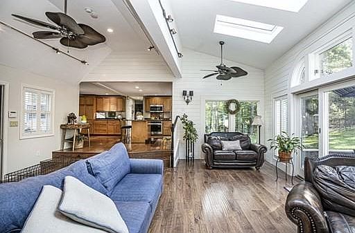 Stunning Contemporary Cape style home that shows style and character throughout; farmhouse design with lots of updates and added amenities. Step-down family room features attractive shiplap paneled walls, vaulted ceilings with skylights and fans and atrium doors leading to the breathtaking backyard patio waiting for you to entertain & surprise your guests. Everyone will enjoy the firepit with bench, built-in grill and pizza oven, wood & stone framed pergola with hot tub and more. Updated Kitchen w/ eating area, island and lots of cabinets. Master Bedrm is very private located in a separate area over garage & features walk-in closet, sitting area & elegant bath w/ separate tub and shower, double vanities with granite & skylights. 2 bedrooms and office on the second level with remodeled bath w/tiled shower & radiant heated tile floor. Fin Lower Level with guest/game rm. Well water softener, neutralizer and aertor system. Generator panel, whole house surge suppressor,irrigation system