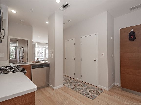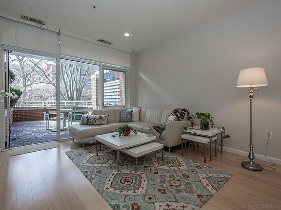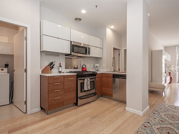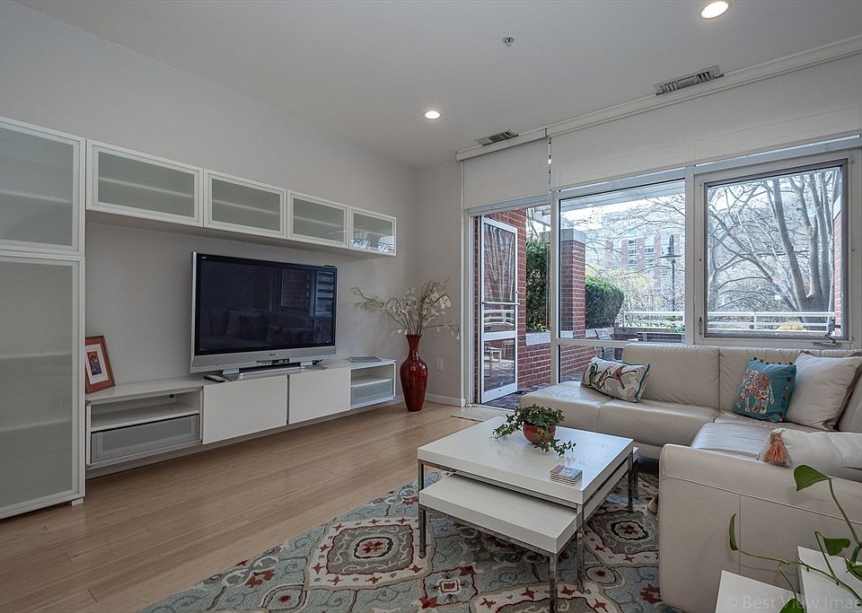 Canal-facing patioWarm bamboo flooringSun-drenched interiorIn-unit laundry room