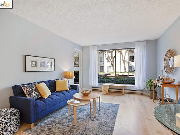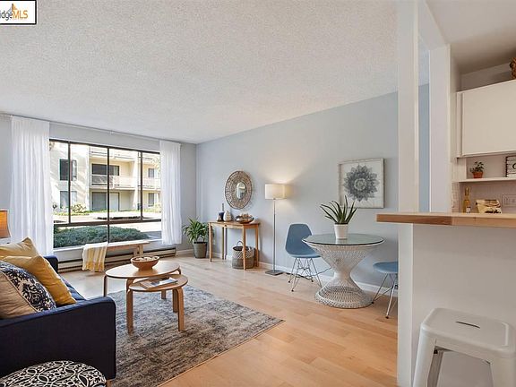 Sunny, updated 1 bed / 1 bath condo in a resort like community. This charming condo has beautiful maple flooring throughout, big windows, and good closet space. Lots of natural light with views of a large tree filled courtyard and glimpses of the bay. The private patio has full bay views. The complex has a year round heated pool and hot tub, plus 3 more summer pools. Tennis courts, plus a fully equipped gym. Amazing location, walking distance to nature trails, shopping, restaurants, transportation. Minutes to SF or Oakland. Building has elevators. No steps to unit. Deeded covered garage parking + private storage unit.
