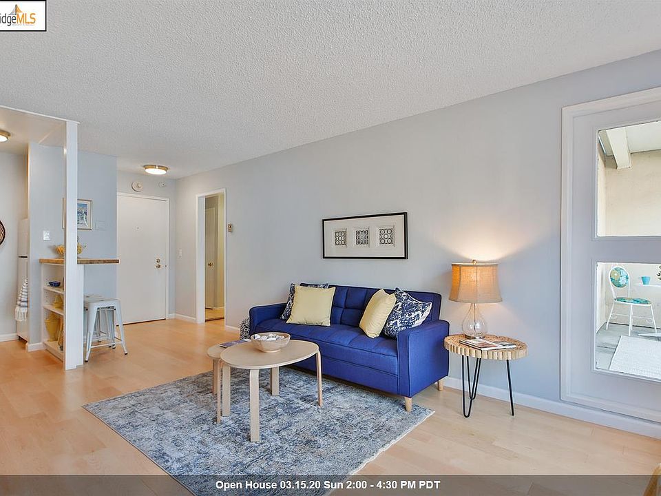 Sunny, updated 1 bed / 1 bath condo in a resort like community. This charming condo has beautiful maple flooring throughout, big windows, and good closet space. Lots of natural light with views of a large tree filled courtyard and glimpses of the bay. The private patio has full bay views. The complex has a year round heated pool and hot tub, plus 3 more summer pools. Tennis courts, plus a fully equipped gym. Amazing location, walking distance to nature trials, shopping, restaurants, transportation. Minutes to SF or Oakland. Building has elevators. No steps to unit. Deeded parking. Open Sunday, 3/15, 2-4:30 for individual showings.