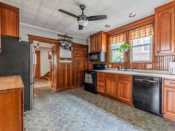 This spacious 5 bdrm, 3 bath 4 square colonial has lots of charm with original wood work, wainscoting, HW floors, and closed in front porch. Bathrooms recently updated. Natural gas brought into home which the on demand hot water runs off. Roof done approximately 5 years ago, large back yard, and cute 2nd floor kitchenette for in-law apartment and zoned for such (multi-family). The current sellers have not used the propane fireplace in living so it may, or may not, function properly, but there is a new heat pump. Garage has been used for storage. Cozy glassed in front porch, large kitchen, formal dining room with built ins makes. This spacious, sweet, clean, charming home is turn key and ready for you. A must see. You won't be disappointed.