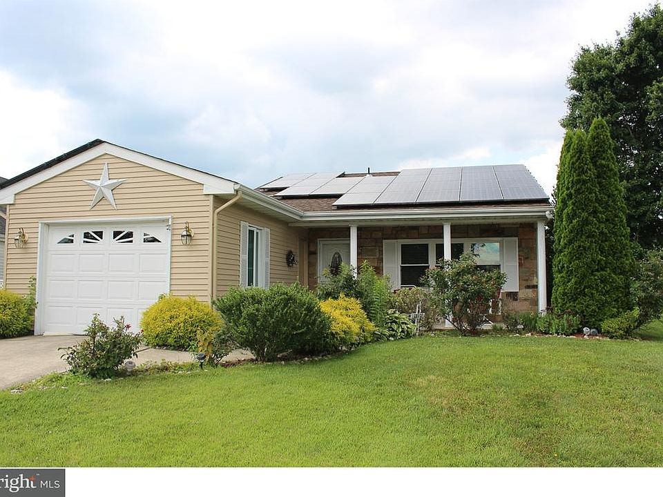 Lake front! Two bedroom 1.5 bath updated Gladwyne Model with beautiful views of the lake. This home has been updated. Cozy front porch with stone accents and access to the garage. Living room and dining room with nice bright laminate flooring leads to the very nice kitchen and sunroom. Kitchen has oak cabinets with very generous cabinet space including pot drawers. Sharp neutral tile backsplash and tile flooring both go well with the cabinetry and the countertops. Kitchen and dining room area overlook the sunroom that is surrounded with windows overlooking the lake. You can exit the sunroom via a door onto your screened porch that also has amazing views of the lake. Out back in the yard is a clear view of the lake from every angle and makes for a very tranquil space to enjoy. There are two bedrooms. The master bedroom has an updated neutral half bath. The main bath also updated with tile tub/shower and flooring along with white accent cabinetry. Second bedroom has lovely view of the lake from the rear window. Both bedrooms are carpeted with neutral coverings. The entire home has newer windows and central air. Up top there are solar panels that transfer with a new owner after purchase and credit authorization with the solar panel company.