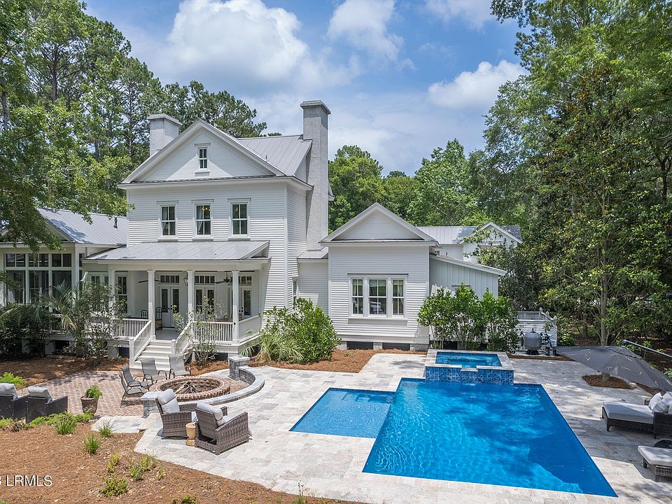 Luxurious Contemporary Farmhouse with Stunning Pool and Breathtaking Vistas in Oldfield - Originally constructed as a showpiece for an exclusive custom builder, the home's high-end finishes exude Lowcountry elegance and comfort. The design takes advantage of panoramic views of the fairway, green, pond & stables beyond. Spaces include a sumptuous gathering room, dreamy kitchen open to casual living, dining room, study, main floor owner suite, two 2nd floor ensuites, suite above detached 2-car garage + cart barn, and 3 porches. This timeless home with enchanting views offers a lifestyle of relaxation, richness, and Southern charm.