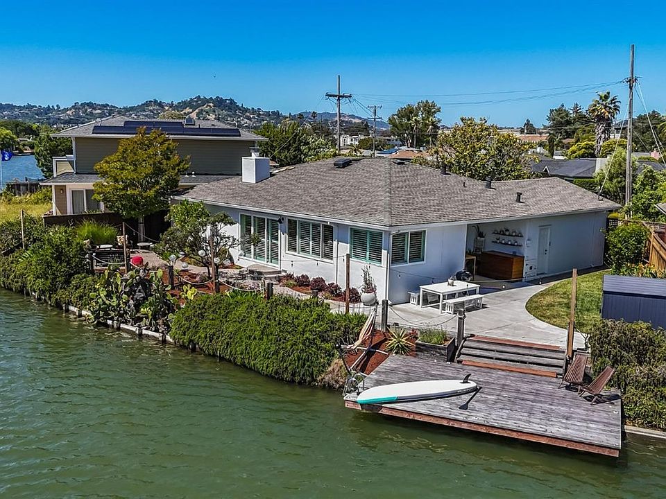 This stylish, extensively updated single-level, 3 bedroom, 2 bath home w/ an additional office in the heart of Corte Madera, is ideal for those seeking a serene, vacation-at-home feeling while still being in fantastic proximity to so many amenities. Enjoy stunning views of Mt. Tam & the beautiful lagoon, where you can indulge in various water sports or simply relax while watching a variety of birds & occasional otters visit throughout the year. The southwest-facing orientation ensures great natural light throughout the day & gorgeous sunsets in the evening, enhancing the relaxing environment. The wonderful layout features great flow with a gorgeous kitchen that opens into the dining area, a spacious living room w/ fireplace, a bedroom wing on one side of the house, a private office & a garage connected to the kitchen that currently serves as a gym. Two patios & a dock provide terrific entertaining spaces. Additional features include AC, whole house fan, tesla charger, custom wood shutters & many other updates throughout. Ideally located, this home is just blocks away from the Town Center shopping center, highly-rated schools, & Corte Madera Town Park. Don't miss this rare opportunity to own a water lover's paradise that's a perfect blend of nature, views and convenience!