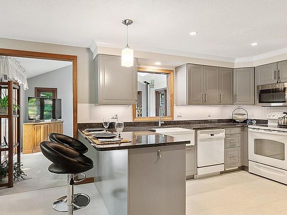 - Kit Dscrp: Dining Area, Countertops - Stone/Granite/Solid, Cabinets - Upgraded, Flooring - Stone/Ceramic Tile, Remodeled, Peninsula, Lighting - Overhead, Lighting - Pendant