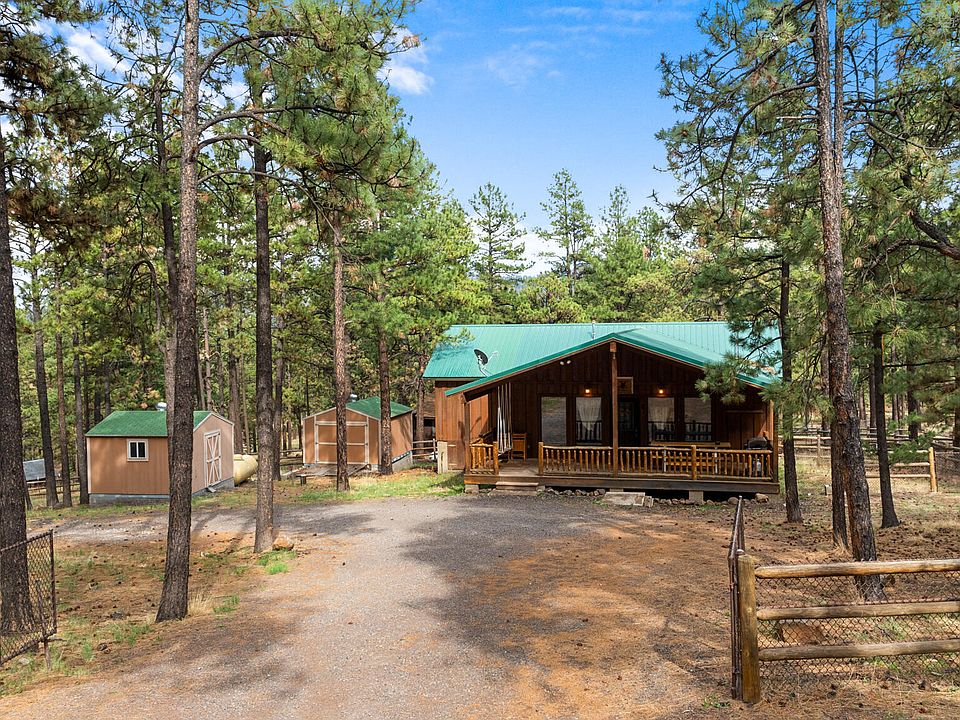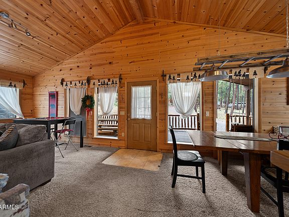Escape to your own woodland retreat in the heart of Greer, Arizona. This beautifully crafted 1,568 square foot log cabin sits on 0.60 acres of mature pine forest, offering complete privacy in this beloved mountain community. The cabin comes completely furnished with everything you see, making it move-in ready for weekend getaways, vacation rental investment, or year-round living. Built in 2004 with pine walls and vaulted ceilings throughout, the cabin features an inviting open floor plan centered around a striking stone fireplace. The well-appointed kitchen boasts stainless steel appliances, granite countertops, and a breakfast bar, while large windows showcase the surrounding forest from every room. The thoughtful layout includes two master bedrooms, each with a bathroom featuring double vanities. One bedroom offers a cozy window seat and ample closet space, while the second charms with custom bunk beds adorned with wagon wheel details and a small dining area. The warm wood-paneled walls create an authentic mountain atmosphere throughout.