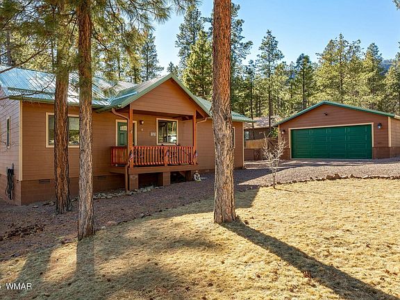 Nestled in the tall pines of the White Mountains, this charming 3-bedroom, 2-bathroom home offers a spacious study/office, a kitchen equipped with a gas range and breakfast bar, and a great room with a cozy wood-burning fireplace. The airy, open floorplan is flooded with natural light from large windows, creating a warm and inviting atmosphere throughout. The home is heated with a propane forced air system, ensuring comfort year-round. The large primary bedroom features an ensuite bath with a walk-in shower, and the vanities and pony wall are adorned with faux stone for a modern touch. Enjoy outdoor living on the expansive covered back deck, which spans half the length of the home, or relax with a cup of coffee on the cozy covered front porch. The property also boasts a brand new, fully finished 600-square-foot garage with additional storage space above, plus a 10x10 ft utility shed on the other side of the home for even more storage options.